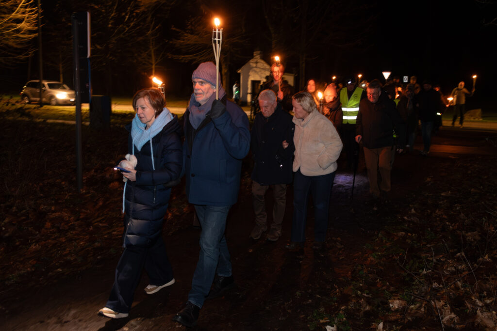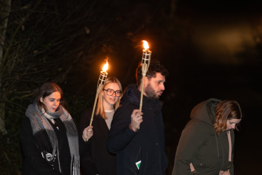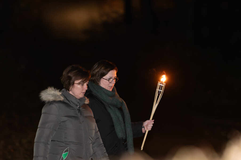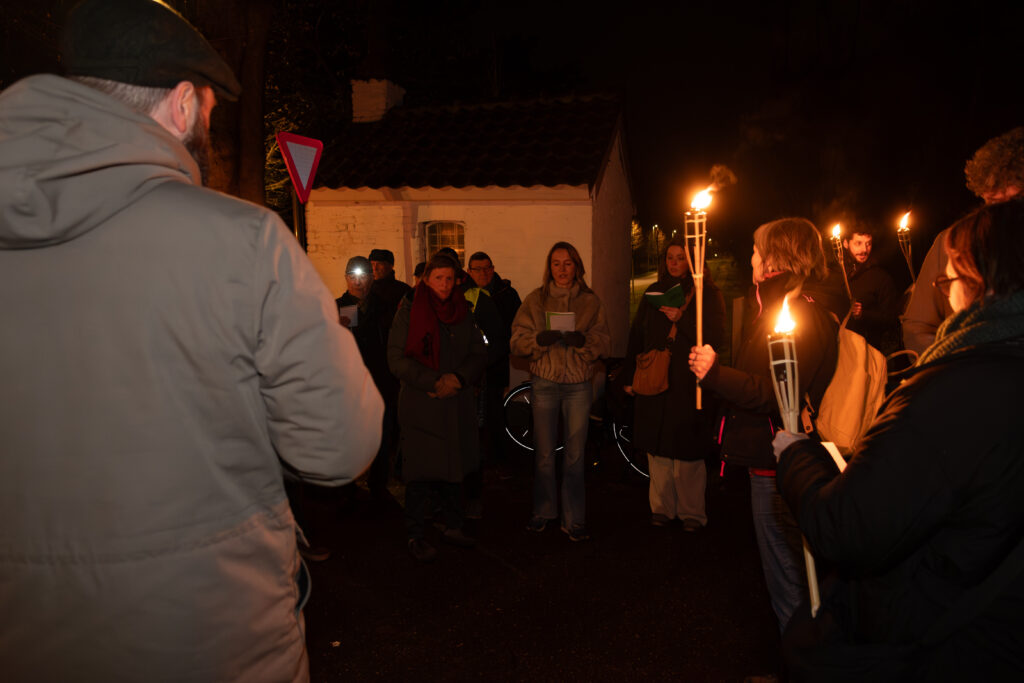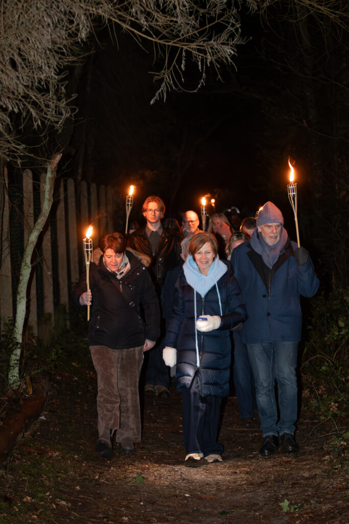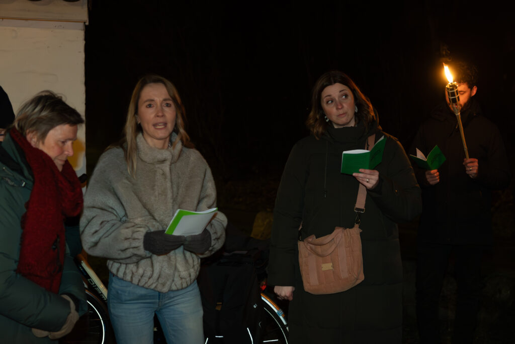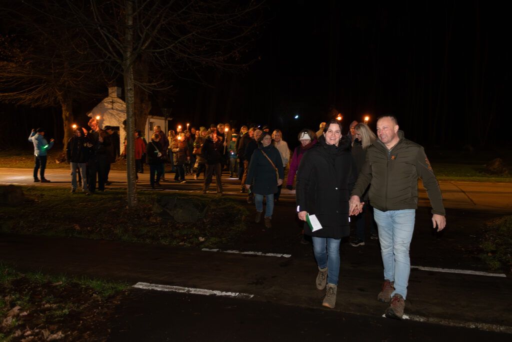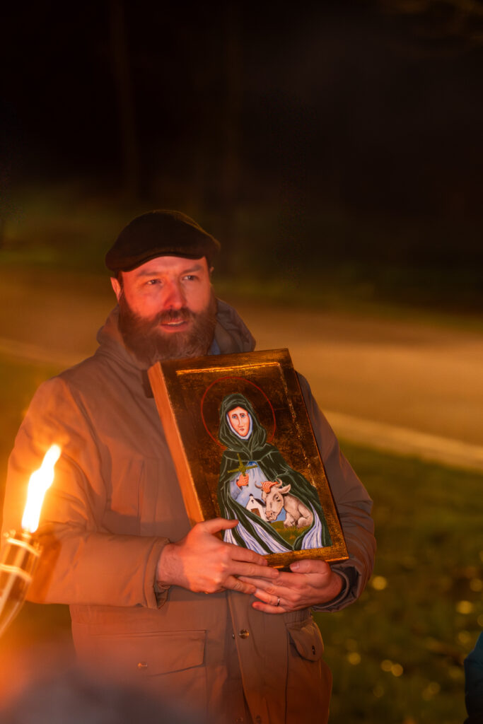 Verlicht met fakkels en begeleid door Ierse songs wordt de icoon op 4 februari door het bos terug naar de thuisbasis in het Sjoalhuus gewandeld.